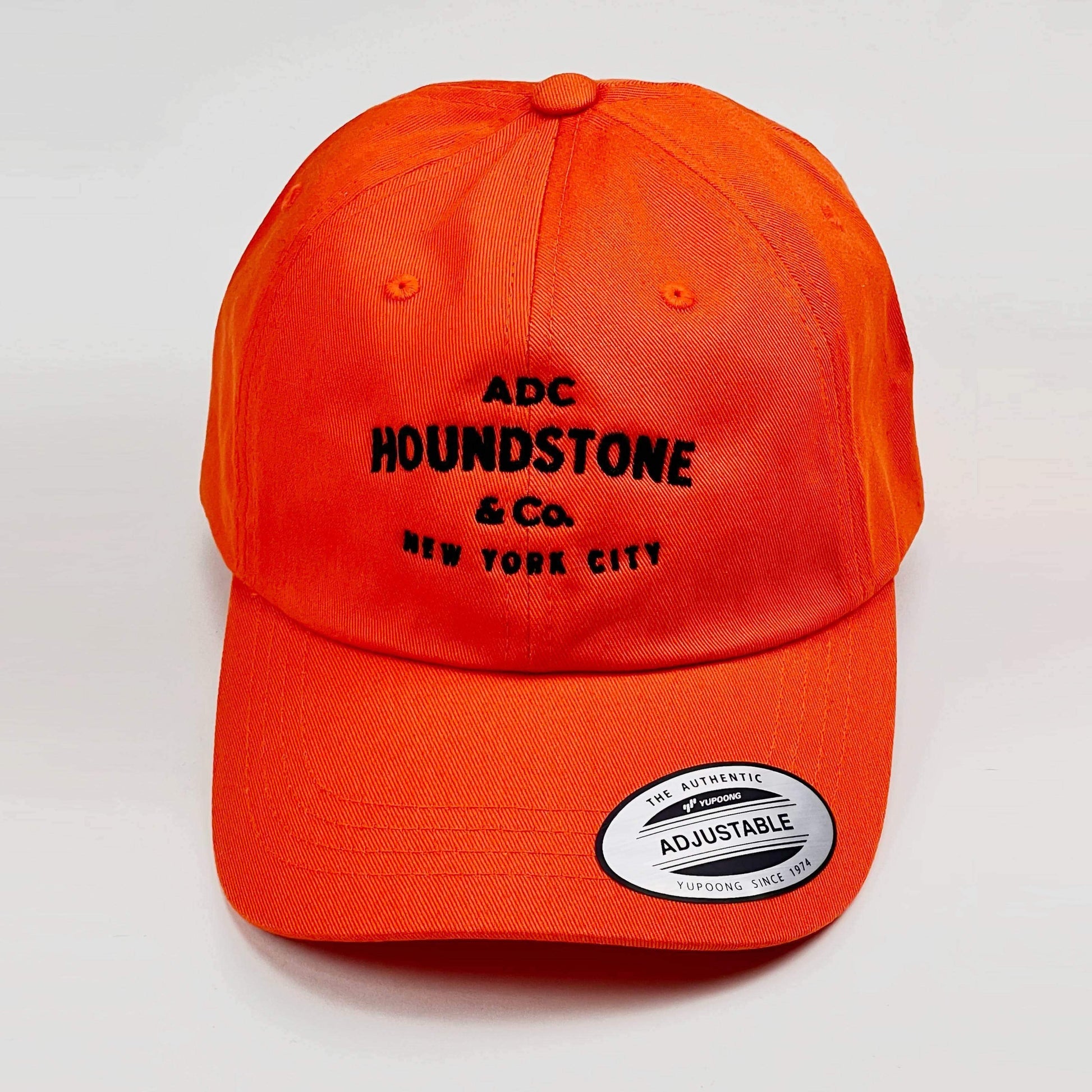 Twill unstructured cap in blaze orange twill with black embroidered Houndstone logo. Adjustable buckle back.